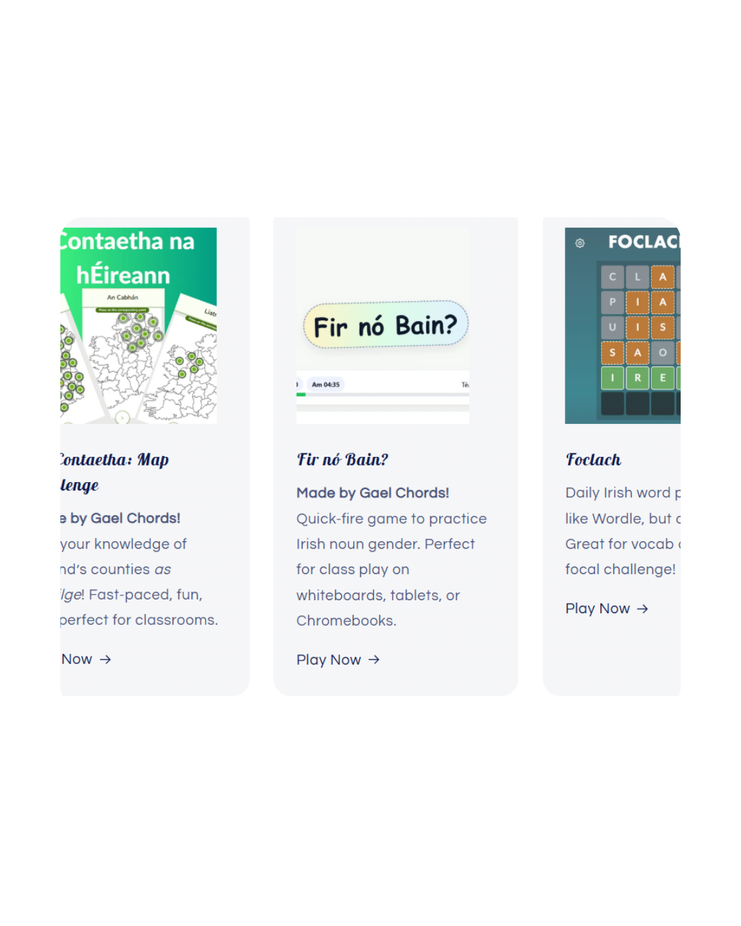 That is why you will find a whole Cluichí section here on Gael Chords. From quick brain breaks to interactive digital games, these are things I use myself and that any teacher can drop straight into their lessons.